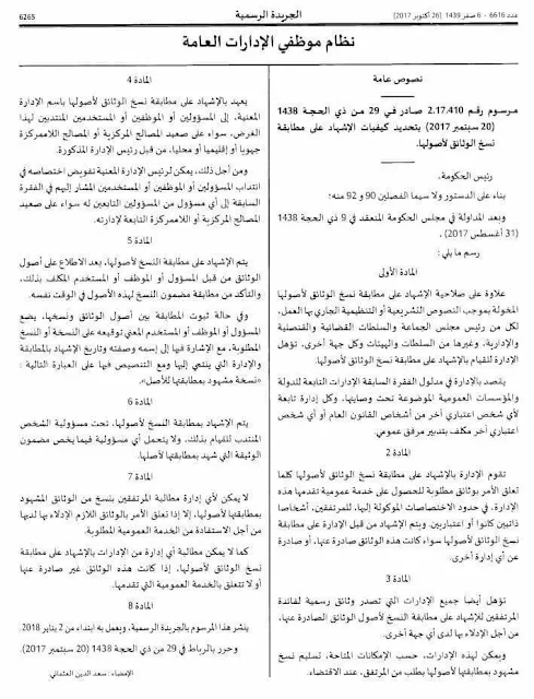 وبناءا على مرسوم صدر في العدد قبل الأخير من الجريدة الرسمية، ويحدد كيفية الإشهاد على مطابقة النسخ لأصول، فقد أصبح بإمكان جميع الإدارات التابعة للدولة والمؤسسات التابعة لها، القيام بالإشهاد على مطابقة أصول الوثائق والمستندات سواء كانت صادرة عنها، أو صادرة عن أي إدارة أخرى.